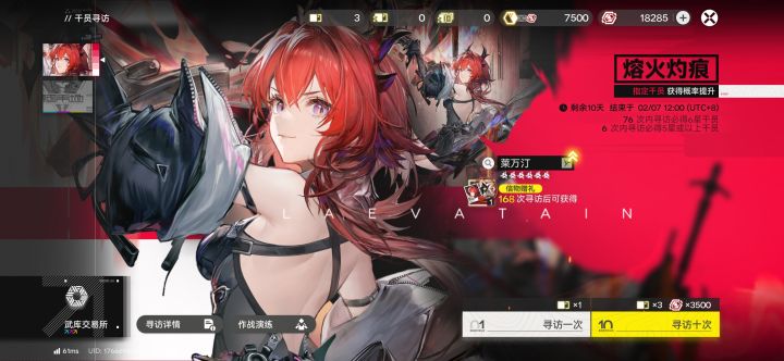 抽卡角色抽一次十连5000,六星概率0.8%,目前我常驻71抽出的骏卫,up池77抽出的莱万汀,保底吃满了好在没歪,也别和我说什么不抽角色也能玩,我玩二游不抽角色玩什么。