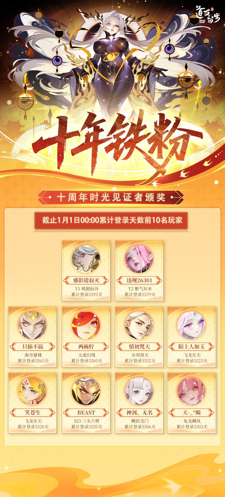 ★ 评选依据:截至2025年12月31日,游戏内历史累计登录天数排名前十的道友。