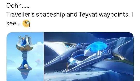 在推特上面看到一位大佬用旅行者的飞船与提瓦特大陆上的传送锚点,还有寒天之钉进行了细节比较,还真发现这三样东西之间是有关联的。首先配色方面就已经非常相似了,他们三个同样都是白色搭配金色的外壳以及蓝色的内芯,难怪传送锚点虽然已经在提瓦特大陆存在那么长时间了但是旅行者一降临到提瓦特大陆就会使用这个道具。