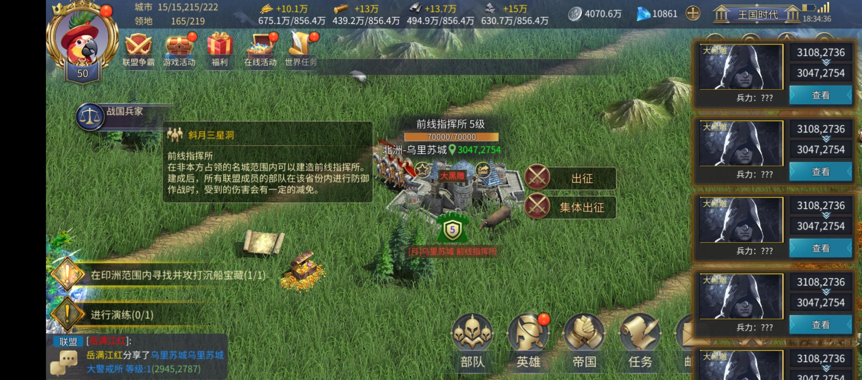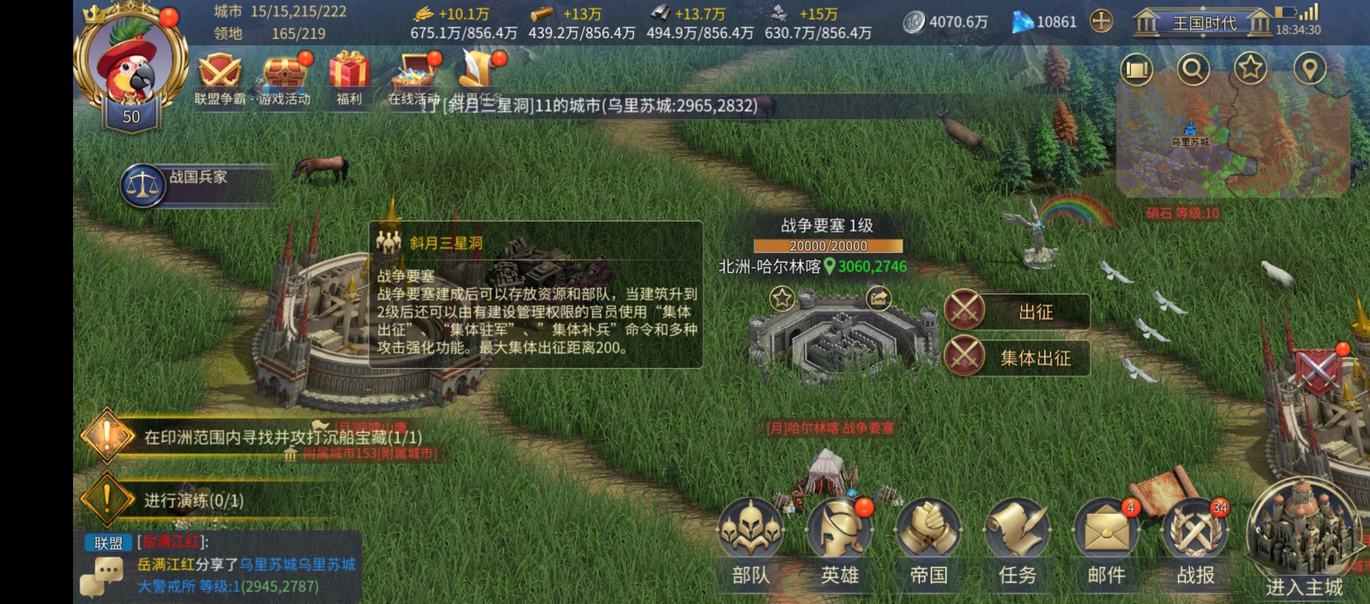 ②2级战争要塞,联盟官员可使用“集体出征”、“集体驻军”、“集体补兵”等多种命令和多种攻击强化功能。