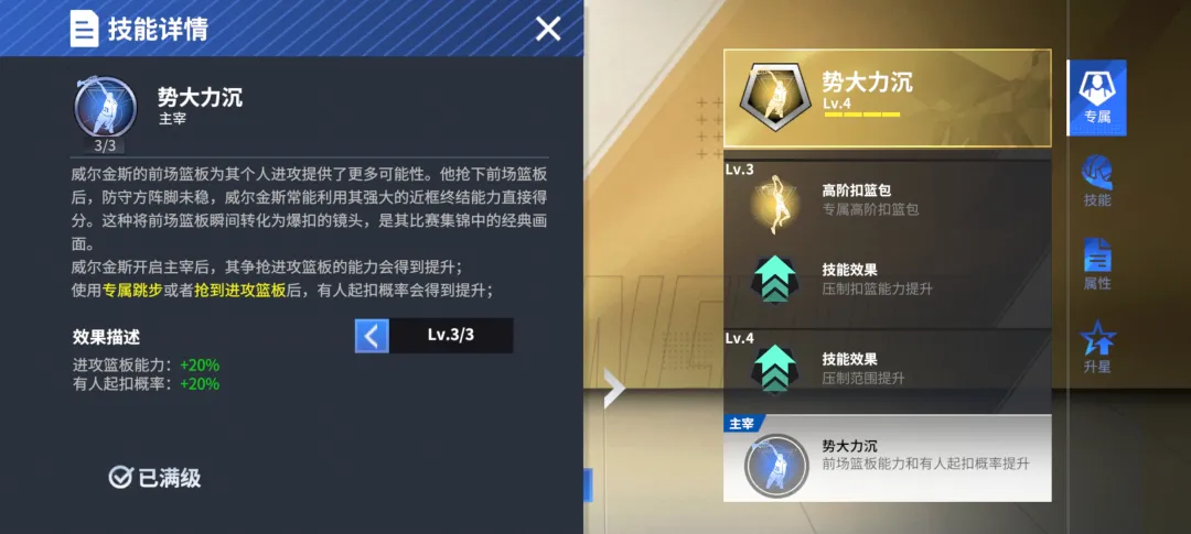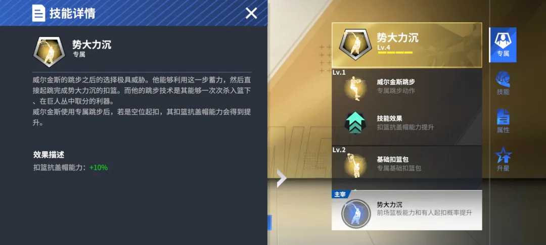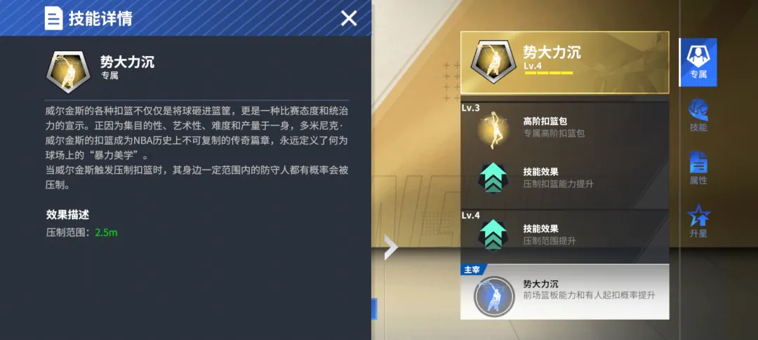 4级专属:提升压制扣篮后的压制范围,扩大到2.5米,一人压制对方全队,还有什么背景板比这个更有说服力?这一扣代表的不只是得分,还有威尔金斯对扣篮的极度自信!你们三人齐上,我威尔金斯何惧!