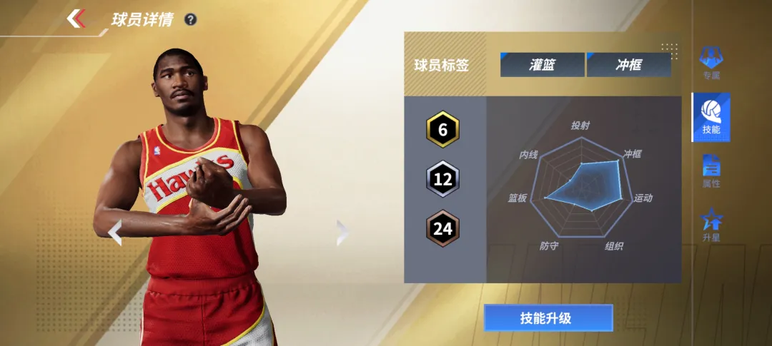 3级专属:解锁高阶扣篮包,且跳步后起扣能力+15%,若只有单一防守者压制扣篮能力+15%。威尔金斯在场上,主打一个以寡敌众!运球过掉重重防守后,跳步压制对方内线简直不要太轻松,防守威尔金斯,建议你们篮下挤满人,不然一旦找到机会,威尔金斯不介意背景板换着人来!