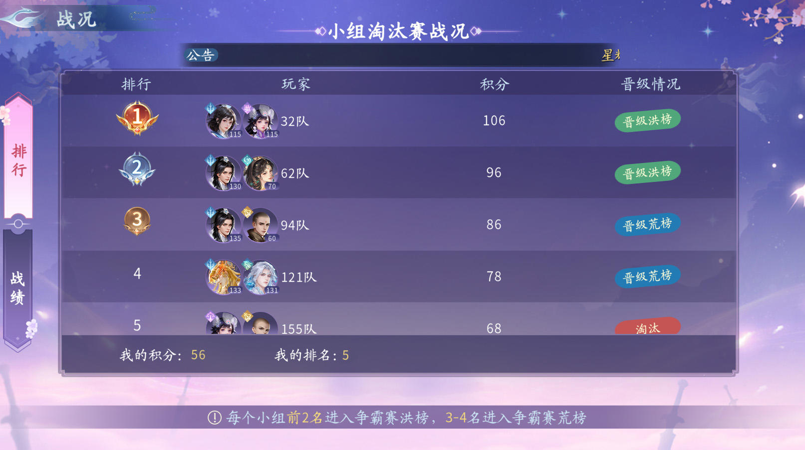 每个小组积分前2名进入后续争霸赛洪榜,积分3-4名进入后续争霸赛荒榜。