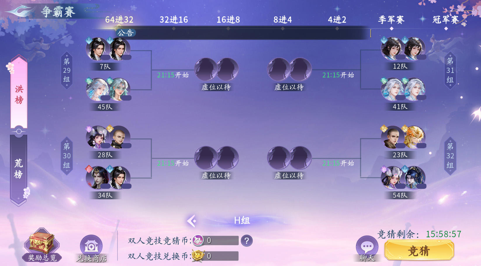 小组赛跟争霸赛开赛前,可以进行竞猜;仙友每次竞猜需花费指定双人竞技竞猜币,竞猜正确可获得双人竞技兑换币,竞猜失败将不获得任何奖励。