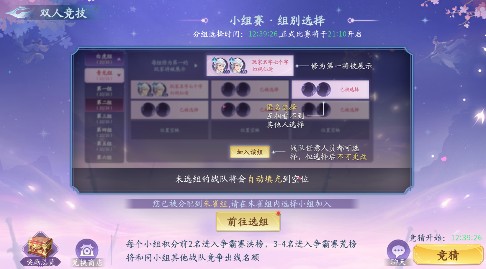 进入小组赛后,会先进行选组,选组时间为5:00-18:00;仙友们会被自动分配到3个大组,可在大组内选择自己要参与的小组(规定时间内未选择小组的玩家将被自动分配)。每个组别实时战力第一名将直接显示,其他仙友的信息将被隐藏.