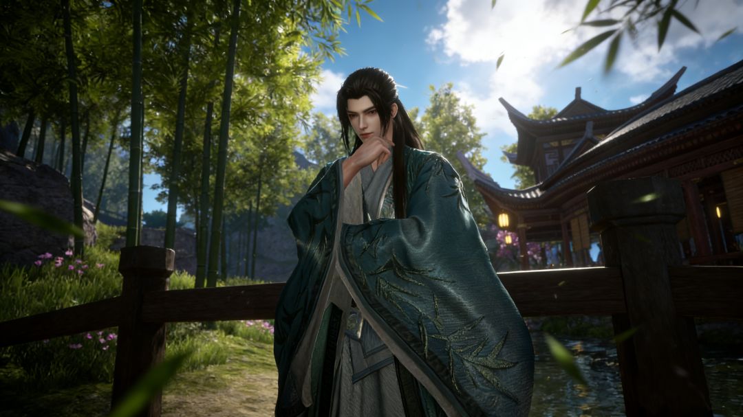 这一身颇具返璞归真之韵。衣袖间翠竹隐现,更添了几分清逸;长衫宽袖、发随风起,亦隐隐透出入世归隐的从容气度。眉眼沉静如古井,仿佛能从中探见他始终如一的向道之心。