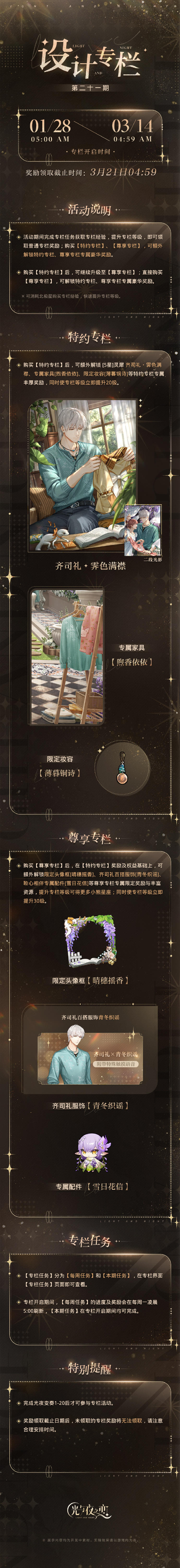 ・购买【特约专栏】后,可额外解锁 [5星]灵犀 齐司礼・霁色满襟、专属家具[煦香依依]、限定妆容[薄暮铜诗] 等特约专栏专属丰厚奖励,同时使专栏等级立即提升20级。