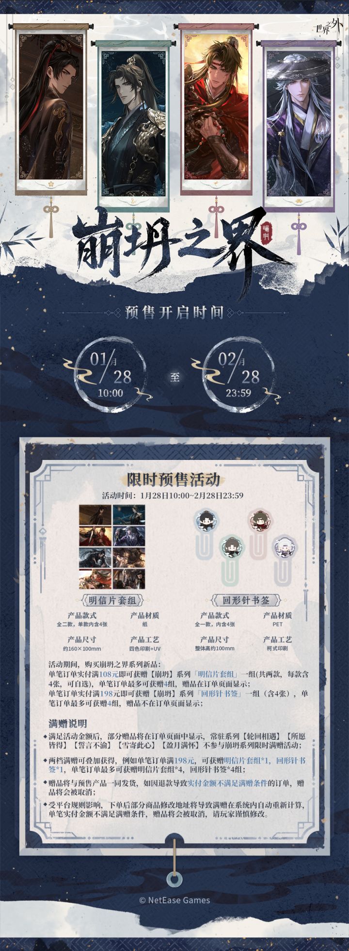 ✦单笔订单实付满108元即可获赠【崩坍之界】系列「明信片套组」一组(共两款,每款含4张,可自选),如需复选款式,请在订单页面中备注,单笔订单最多可获赠4组,赠品在订单页面显示;