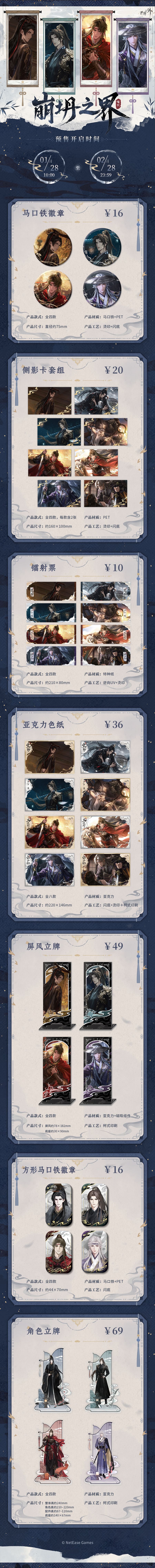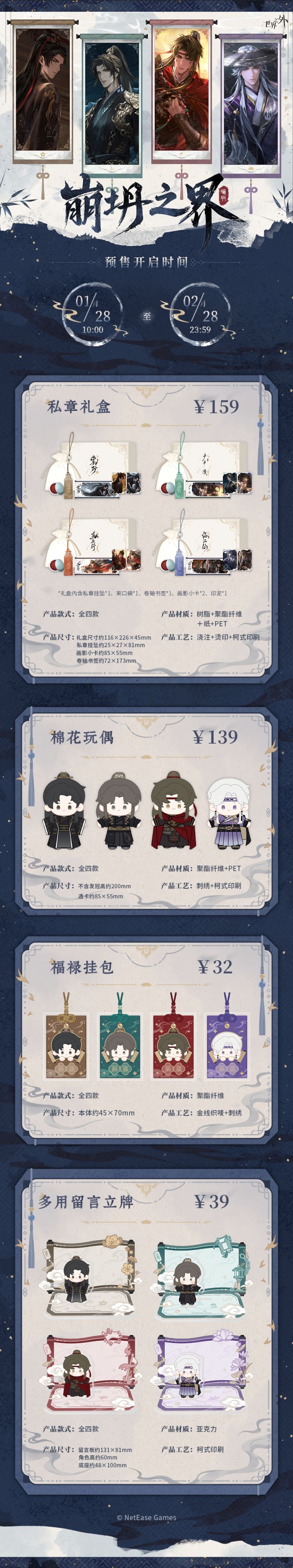 ✦崩坍之界:私章礼盒、棉花玩偶、马口铁徽章、方形马口铁徽章、侧影卡套组、镭射票、亚克力色纸、角色立牌、屏风立牌、福禄挂包、多用留言立牌