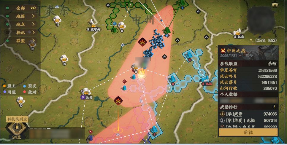 继在陈留关口抢点取胜后,【华夏苍穹】在关中再传捷报。关卡解封后,他们与【龙跃在渊】同时向太原郡铺路,随即爆发大规模交战。【龙跃在渊】不敌,被成功堵在关卡之外。【华夏苍穹】乘胜进军,一举拿下八级城太原郡,并已向九级城继续铺路。