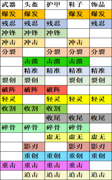 (5) 刻印属性分部位,大多数刻印只会出现在3或4个部位上,不是全部,参见下表