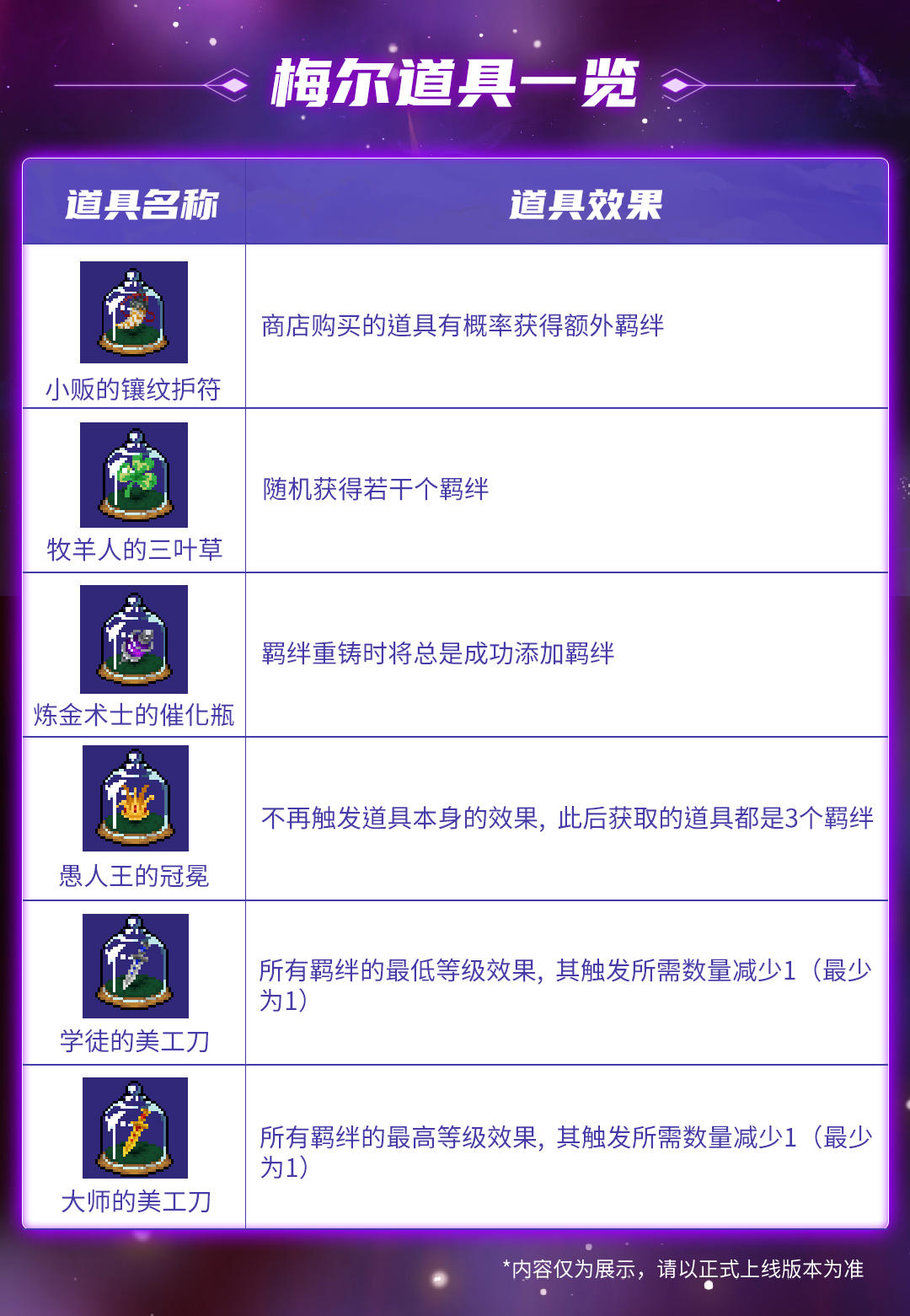 修罗幻境里的神秘人梅尔现在将为各位战士提供6种“梅尔道具”,助力大家进行羁绊构筑。
