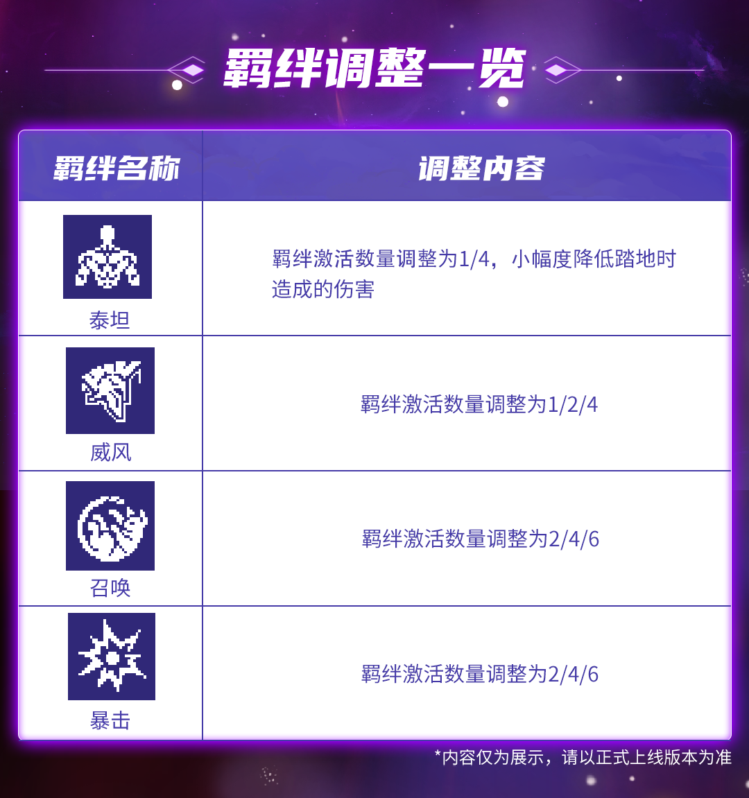 在新版本中,“道具羁绊系统”将调整为游戏常规玩法,战士们可以在空间碎片模式、模拟战模式体验,战场模式维持原有道具玩法不变。我们新增了9种道具羁绊,并对部分原有羁绊进行调整,具体可见下方表格:
