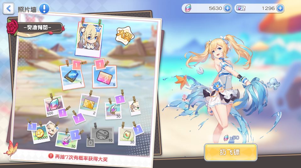 ❀ 奖励说明:总共十次抽取次数,一共需花费5450钻石,第8次及以后即有概率提前抽出最终大奖~