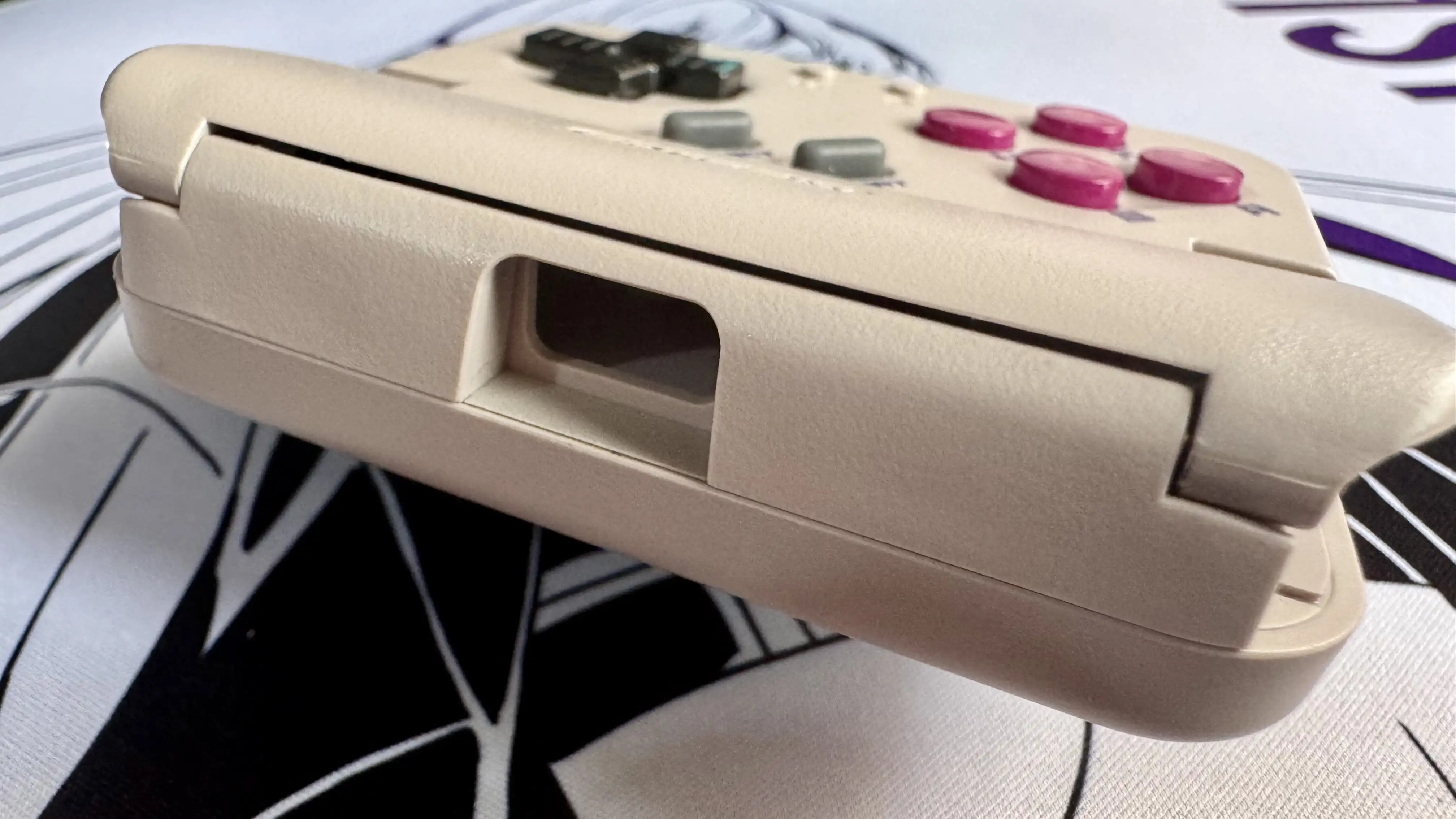 塔可手柄外观设计很难不让人联想到刚刚提到的 Game Boy 经典掌机。玫红色的 ABXY 按键、倾斜排列的 Start 与 Select 键,甚至连字符字体都透着一股复古的调调。更让我惊喜的是它的竖向夹持设计,手柄拉开就能自动开机,合上就能自动关机,这种智能开关机的设计简直不要太方便。