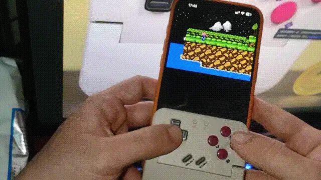 塔可的重量只有 62 克左右,加上收纳保护壳约 86 克,整体非常轻巧。而且手柄的夹持力度恰到好处,以为我 iPhone15 PM 为例,即使带上手机壳也丝毫不影响。夹齿内侧还配有硅胶垫片,避免了划伤手机边框的风险。将手柄夹上手机后,上半部分显示游戏画面,下半部分是实体按键,瞬间变身迷你掌机,情怀感拉满。