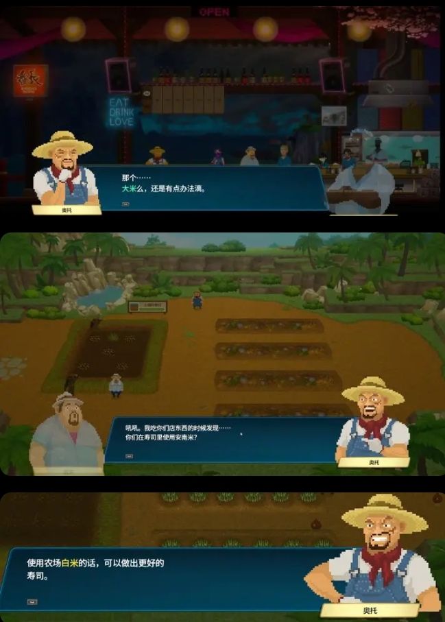 随着主线剧情的推动,会有一名VIP客人(没错,就是那位拍摄《机器人武士》的导演)来到班乔寿司店,他会抱怨这里的安南米不好吃,于是奥托便会给我们一个可以种植白米的小菜园(一天不到就建好的୧(๑•̀⌄•́๑)૭碉堡了)