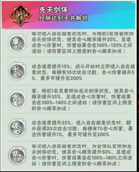 3脉+目标数量,增加会心概率35,此时,小剑仙在开剑匣(自在状态)105会心率,并提高了会心伤害上限,此时是小完全体了。