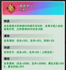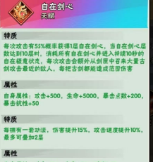 6星特质,每次攻击有55%概率获得1层自在剑心,当自在剑心层数达到10层时,消耗所有自在剑心并进入持续10秒的自在极意状态,每次攻击会额外从剑匣中召来大量古剑攻击最近的敌人,每把古剑都能造成范围伤害。相当于自带剑神兵,当然不止这么简单,该特质是和后续技能联动,数值超模(个数多)