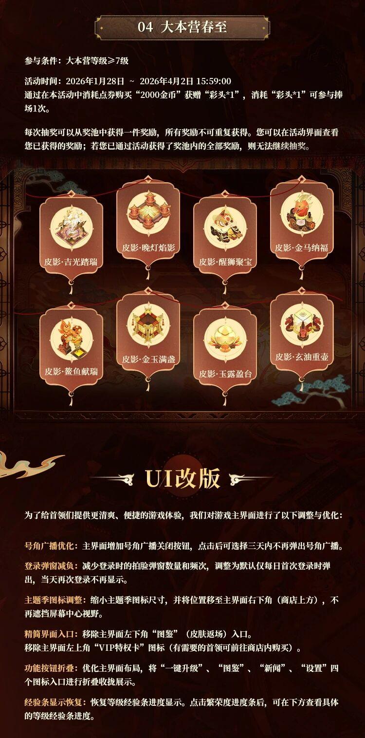 我们将于1月28日早上6:00进行一次维护更新,预计维护时间240分钟。版本更新后,达到4级的首领们可以在商城领取一份维护礼包。