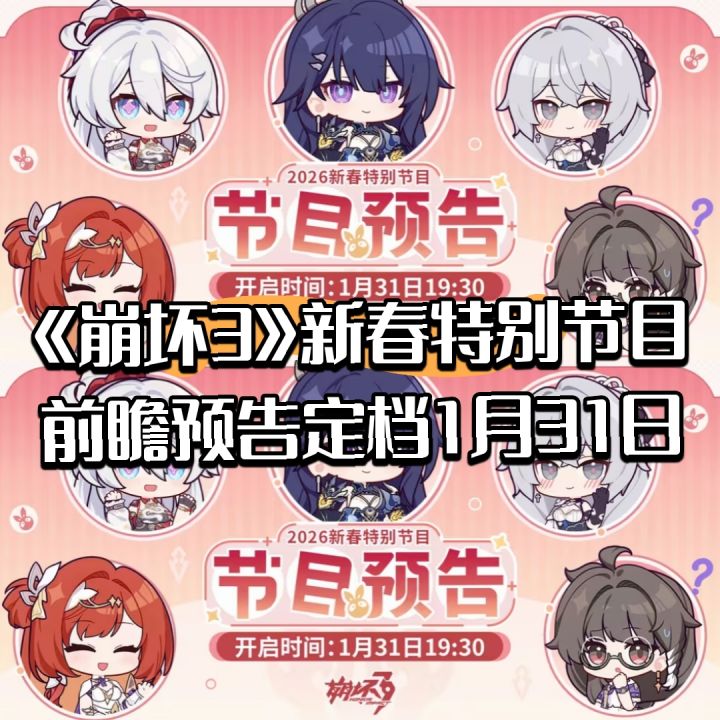 1月27日,《崩坏3》正式宣布2026年新春特别节目将于1月31日晚19:30在爱酱的直播间举行,本次节目以时岁叩晓为主题,将首次公开8.7版本完整内容,包括全新S级角色雷电芽衣「镇×偃月叩晓」、主题活动「正当时:年夜奇缘」以及主线第二部第十一章间章「光所梦寻之夜」等重磅更新内容,狠狠期待了呢![[TapTap表情|TapFamilyxdoro2_粉狗比心]](https://img-tc.tapimg.com/market/images/101c7e3200596fe8e03765080b467fb8.gif)