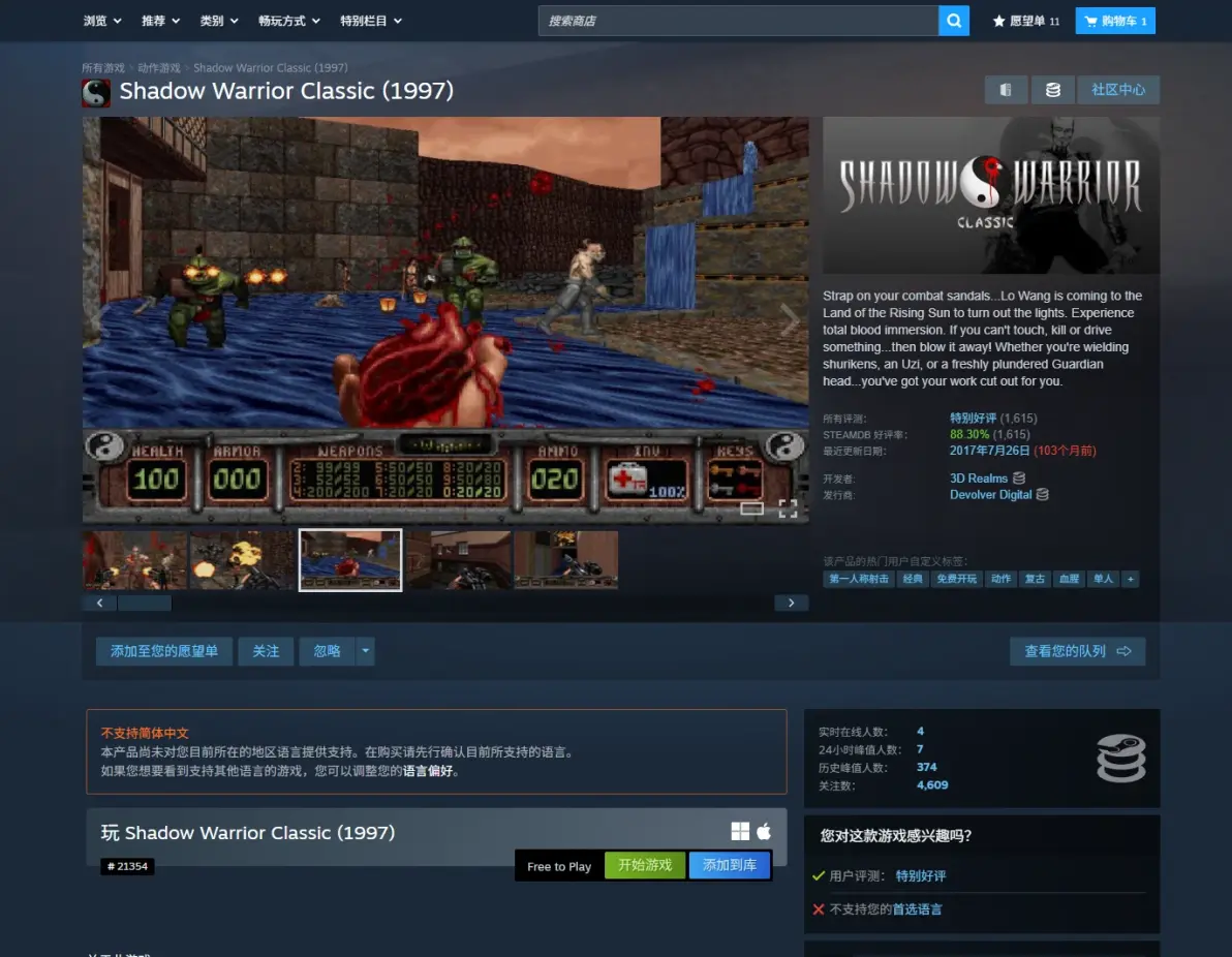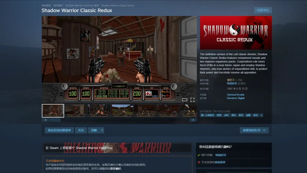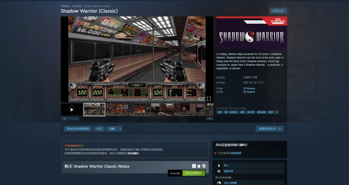 影子武士经典版Shadow Warrior (Classic) 由3D Realms开发并发行,影子武士最初的样子,1997年的游戏,购买后可能运行,需要补丁,steamdb好评率60.9%,游戏不支持中文;史低8.4元,外区最低俄罗斯77卢布低于国区17%,无cdk。
