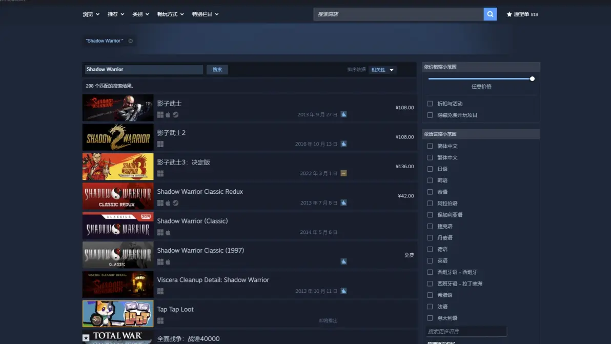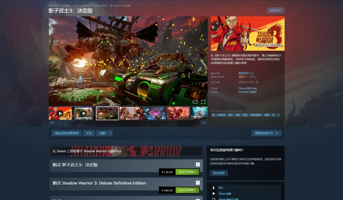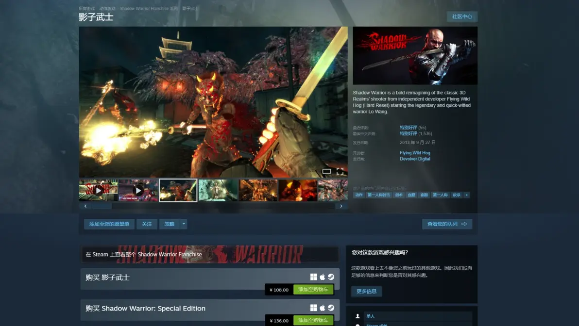 影子武士在steam上可以购买的一共有五个版本分别为Shadow Warrior (Classic) 影子武士经典版,Shadow Warrior Classic Redux影子武士经典重置版,影子武士1,影子武士2,影子武士3:决定版