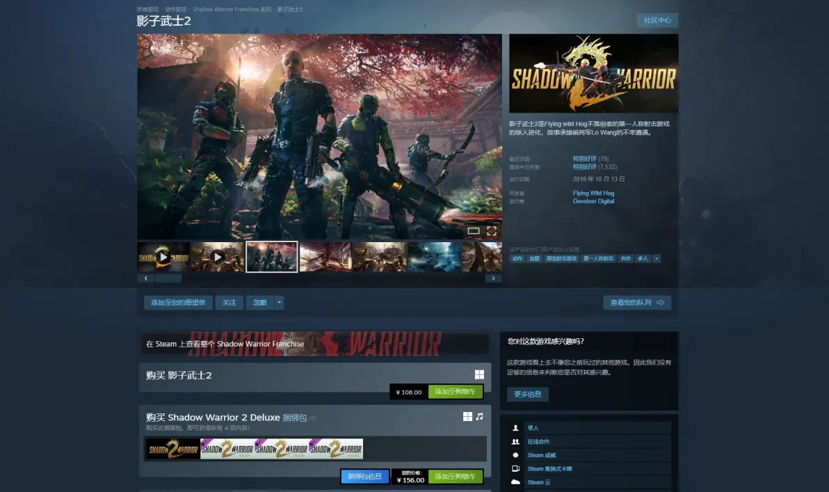 影子武士2,2016年10月13日发行,steamdb好评率85.5%,游戏支持中文;史低10.8元,外区最低南亚1.04美元低于国区32%,steampycdk价格10元,无外区可直购cdk。
