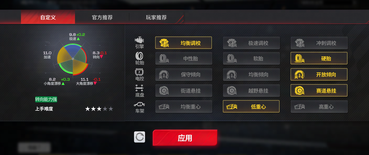 - 【13332|均衡掌控流】:均衡调校+硬胎+开放倾向+赛道悬挂+低重心。适合希望平稳上手、兼顾操控与容错率的车手,是应对多弯综合赛道的稳妥之选。