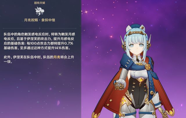 与此同时,固有天赋“象拟中继”得知,伊涅芙还能基于自身攻击力,按照每100点攻击力,来提升0.7%的基础月感电伤害,最高可提14%。