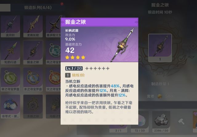 接着就是4星武器推荐,峡湾长歌、匣里灭辰、决斗之枪、风信之锋、掘金之锹。平民玩家的话,首推是掘金之锹,这把武器可以说是伊涅芙的4星专武,而且获取途径非常简单,可以通过铁匠铺锻造获取。