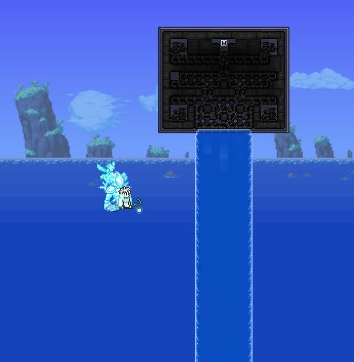 这是一个动态水的一个效果,按以往经验来说,任何液体都会因为一个物块或多个物块导致分流,这个算是分流三次形成的,虽然水流是无限的,但是并不会产生过多液体,只会一点点的增加,如果面积过大,增加的液体则会逐渐消失,可以使用干炸弹或干火箭来进行断流,但是不会影响正常运行,接下来就是步骤分解。