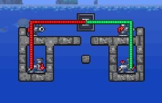 用两种不同颜色的线来连接,避免出错,随后在下方左右水泵位置放一桶水,打开开关测试一下,如果不够就放两桶水,测试的时候用pc端实验的,pc端直接倒水就行,移动端好像有延迟,并不能成功,最后效果就是第一张图那样,这个不像是半砖液体那样的半流动效果,外观是直接倒液体的效果,但是产生的液体却很少,可以利用到建筑或一些功能上,例如你们最爱在出生点附近挖一个直通地狱的洞,虽然我不理解,但是在上方放一个这个,就可以直接流到地狱,效果还是挺震撼的......