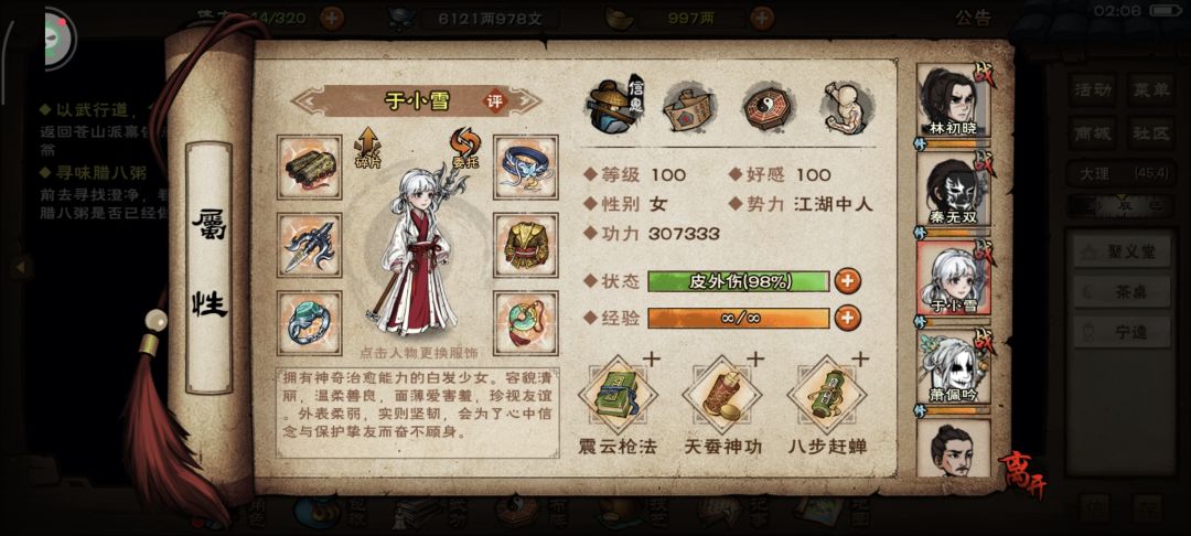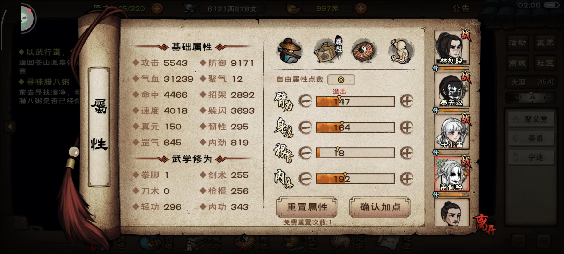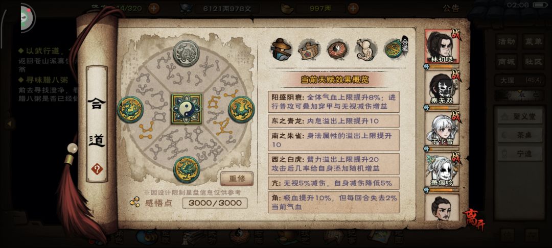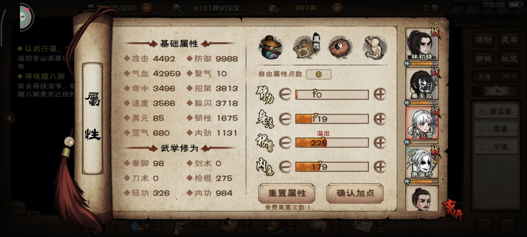 之前忙着考试没时间玩,四棍号鸽了两个月,放假知道萧大加强也是第一时间下回来了,今天一试,用了一个多小时拿下武神殿绝世,破狼还是好用啊,可惜出的太晚了。附上面板截图,个人觉得李子最难,主角容易暴毙(没喝腊八粥,不然不用凹这么久),然后其他都还行,诸葛比较看脸,稀里糊涂就过了。最后附上面板截图,晚上熬夜去建设恒山去了