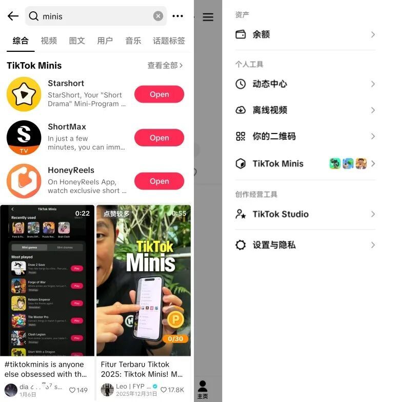 此前测试过的小程序玩法,正式升级成为了内嵌的小程序专区TikTok Minis。和国内抖音小程序的运营逻辑一致,TikTok Minis的核心优势在于能够 “即点即玩”,用户不用离开TikTok就能体验到互动小游戏、微短剧等多元内容。