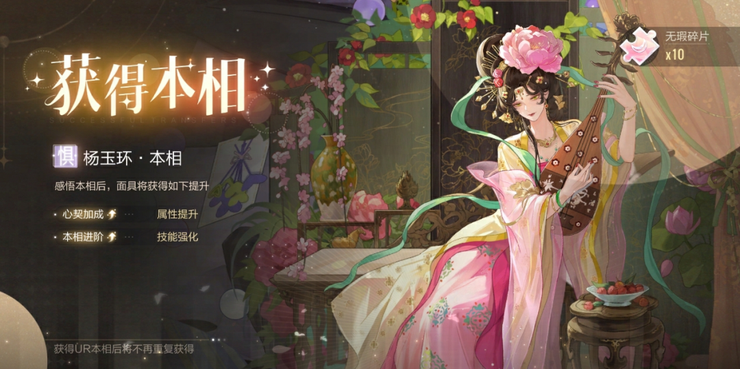 若已经拥有杨玉环面具,再次鉴赏出杨玉环将获得【本相】进阶及额外奖励【无瑕碎片*10】,前往面具馆感悟本相即可解锁属性提升和技能强化效果。在任意合辑进行鉴赏都可获得杨玉环本相,本合辑结束后仍可以获取。