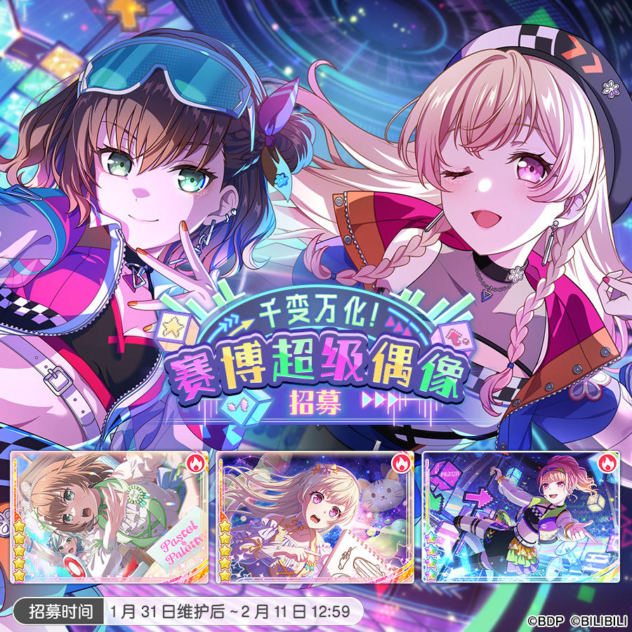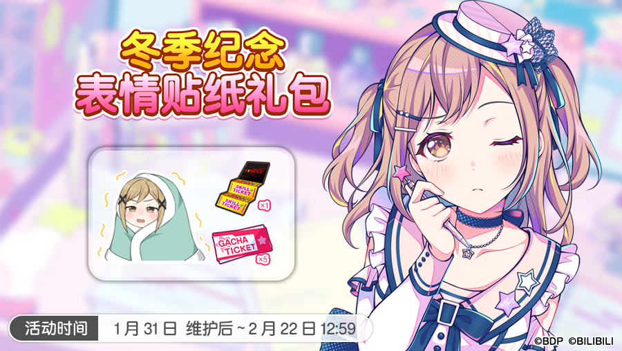 1月31日维护后,游戏内将开启「答案在哪里?在你心底里!」任务演出活动、「千变万化!赛博超级偶像招募」和「POWERFUL属性招募」,并追加原创歌曲《Shine ☆n My Life!》!同时,游戏内将上架全新「冬季纪念表情贴纸礼包」,简中原创·「Pastel*Palettes称号装扮礼包」也将再次上架,「米歇尔贴纸交换所」和「星光贴纸交换所」也将更新。