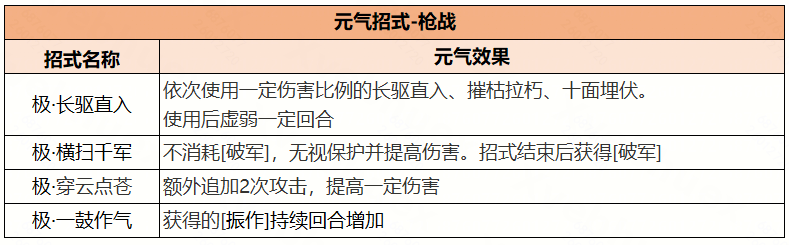 (3)[锐不可当]:释放招式时狂暴概率提高;消耗[破军]释放时,招式附加攻击力提高,招式效率提高
