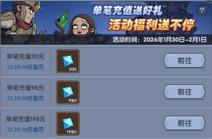 活动期间完成单笔30、98、198元档位充值可以领取高额返利!(仅限30、98、198元档位,其他档位无法满足活动条件哦~)