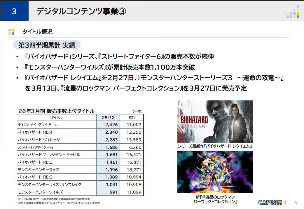 1月27日,卡普空官方正式公开25-26财年第三季度财报,披露本季度核心财务数据及旗下重点游戏销售成绩。