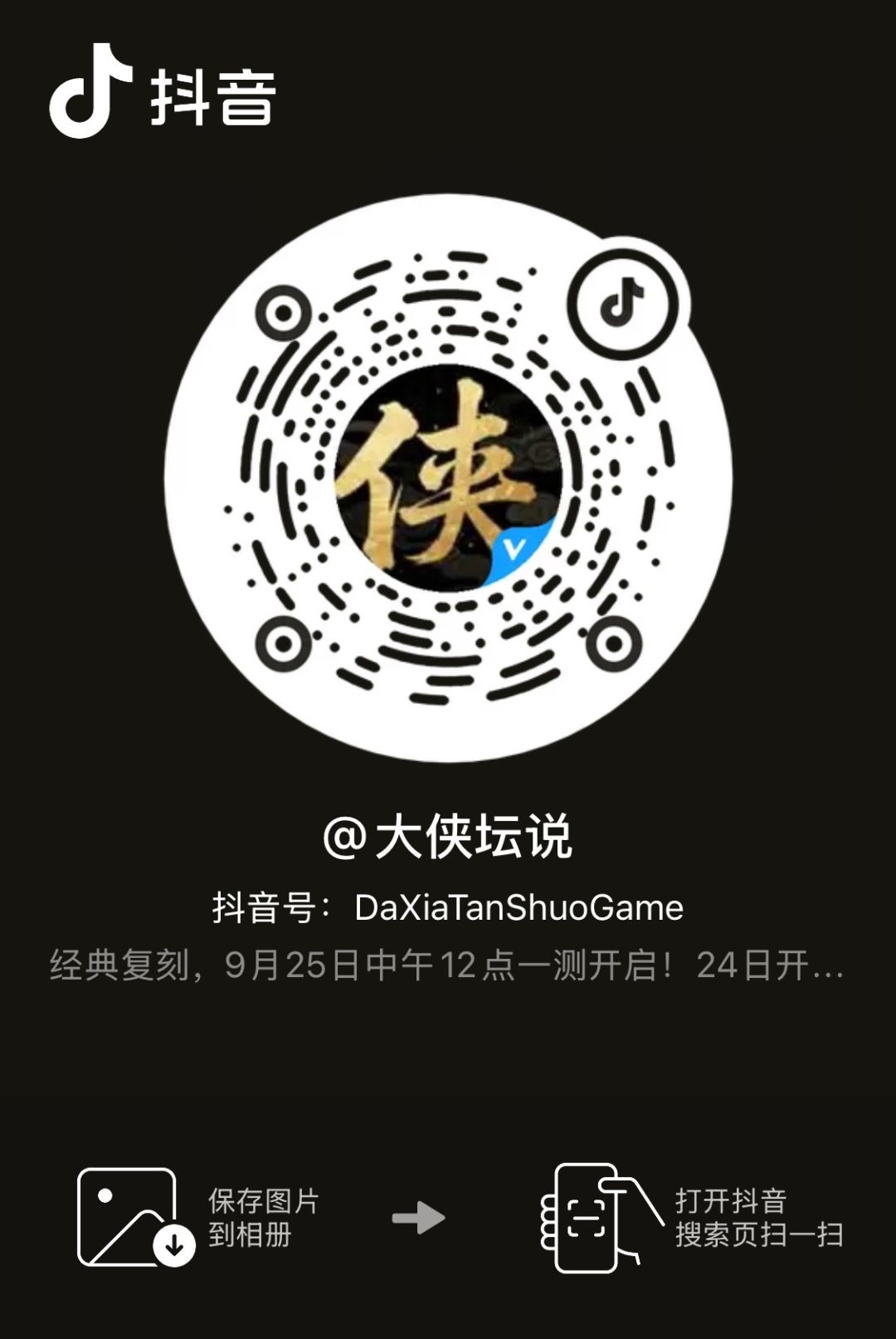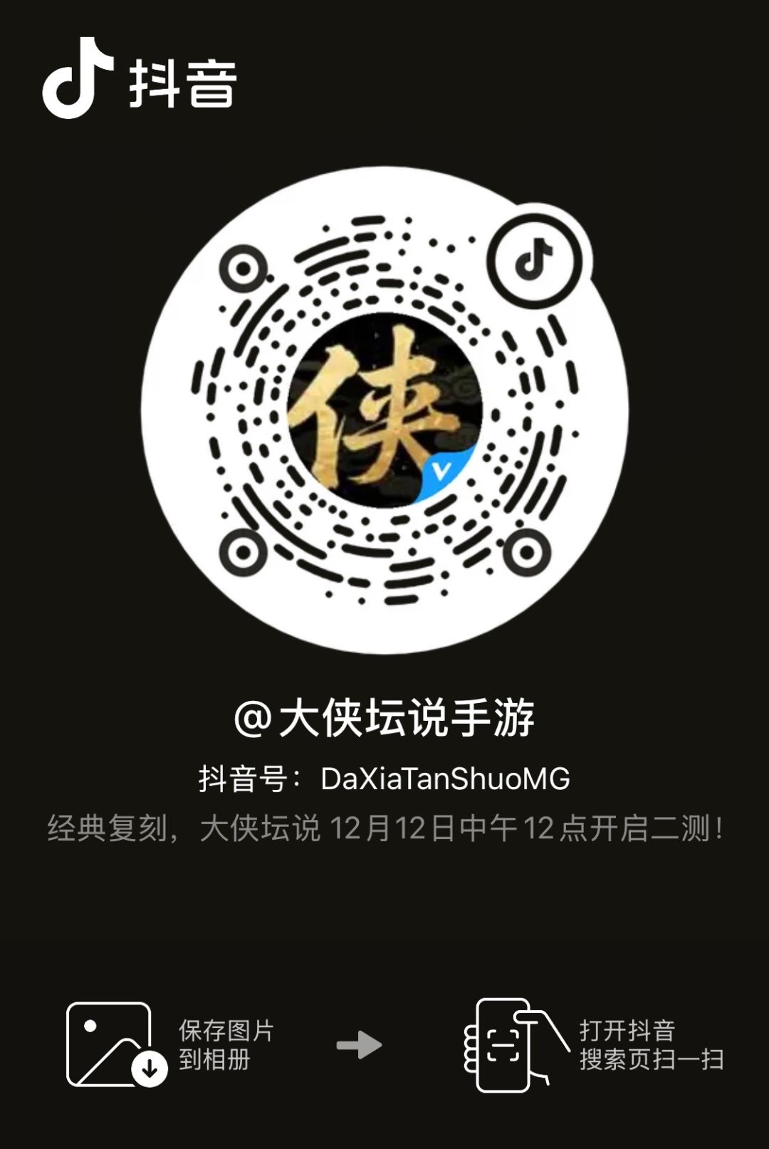 · 关注抖音或快手的任意官方蓝V号,分享官方视频号的置顶公测推广视频:大侠坛说正式服即将开启!转发至个人账号日常内,并进行截图保存!