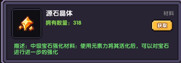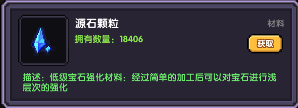 源石颗粒:简称蓝碎,是我们升级宝石等级的必要材料,前期需求量大,对于氪佬到强化45前都缺,主要途径可以通过分解宝石,打宝石资源副本获取