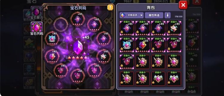 宝石共鸣区可以放入所有品质的宝石,放入的宝石会直接继承中间紫色宝石的星级和等级,这就是聚合所带来的效果,只要养好聚合区便可以大大减少宝石的升星升级材料。