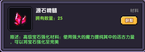 源石精髓:简称红碎,是魔神石强化到10级后面需要的强化材料,前中期需求量大,后期虽然依然需求但可以通过分解魔神石获取(注意是套九后分解没用的魔神石),主要获取途径分解魔神石、商场活动和星界商场购买、资源副本和矿区、材料包开启获取