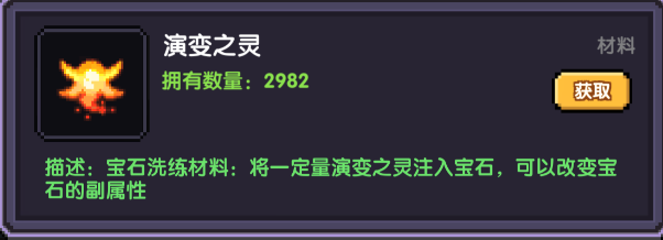 演变之灵:洗练宝石副属性的关键材料,获取途径分解紫橙红宝石、公会战商店、执照商店、星界远航商店、矿区和月限购商店获取