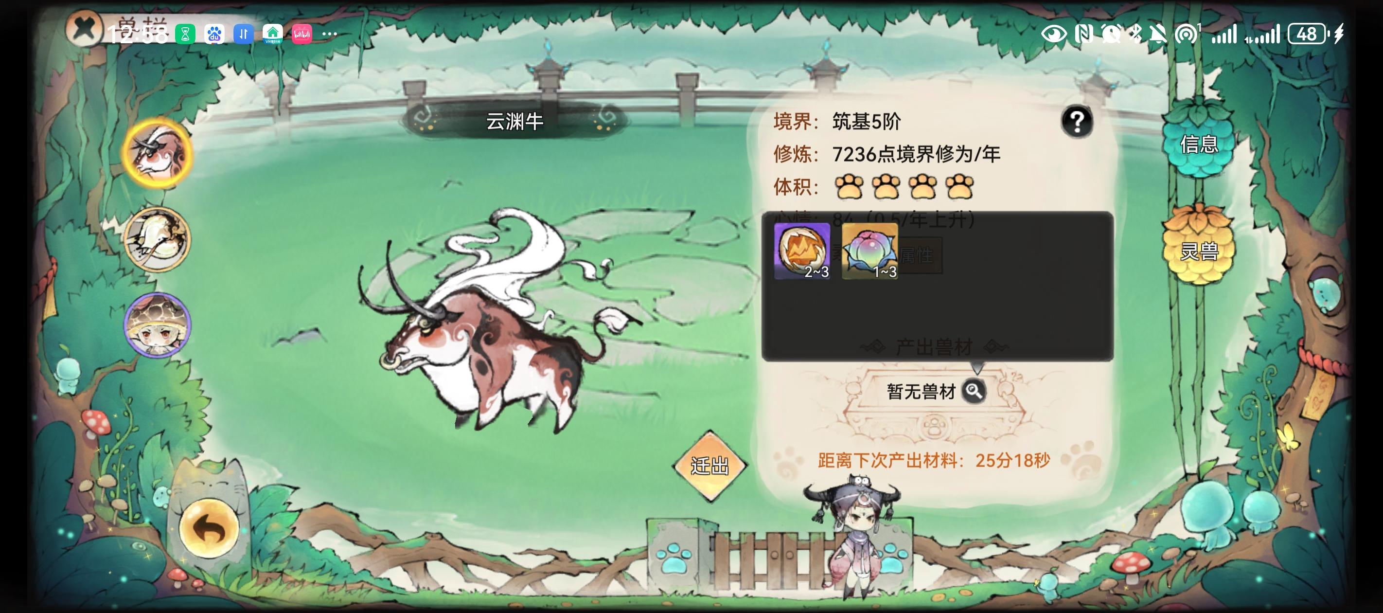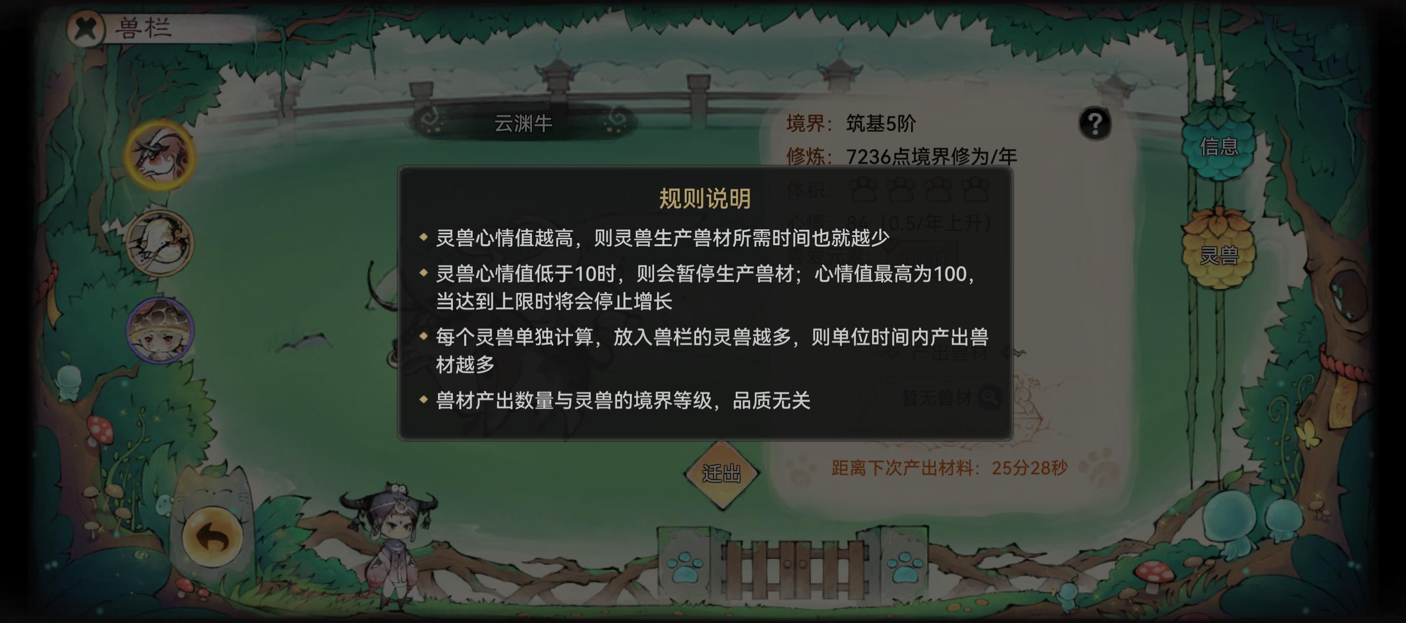 ①兽栏的作用是生产兽材,每个玩家能在灵兽峰建设9个兽栏(三大六小),兽栏的容积固定,大兽栏容积9,小兽栏容积6,每只灵兽体积为2-5(比如蘑菇是2),兽栏能选五行属性,对相同五行的灵兽心情能起到正向作用。心情影响兽材生产时间,兽材生产数量与灵兽境界等级品质无关。
