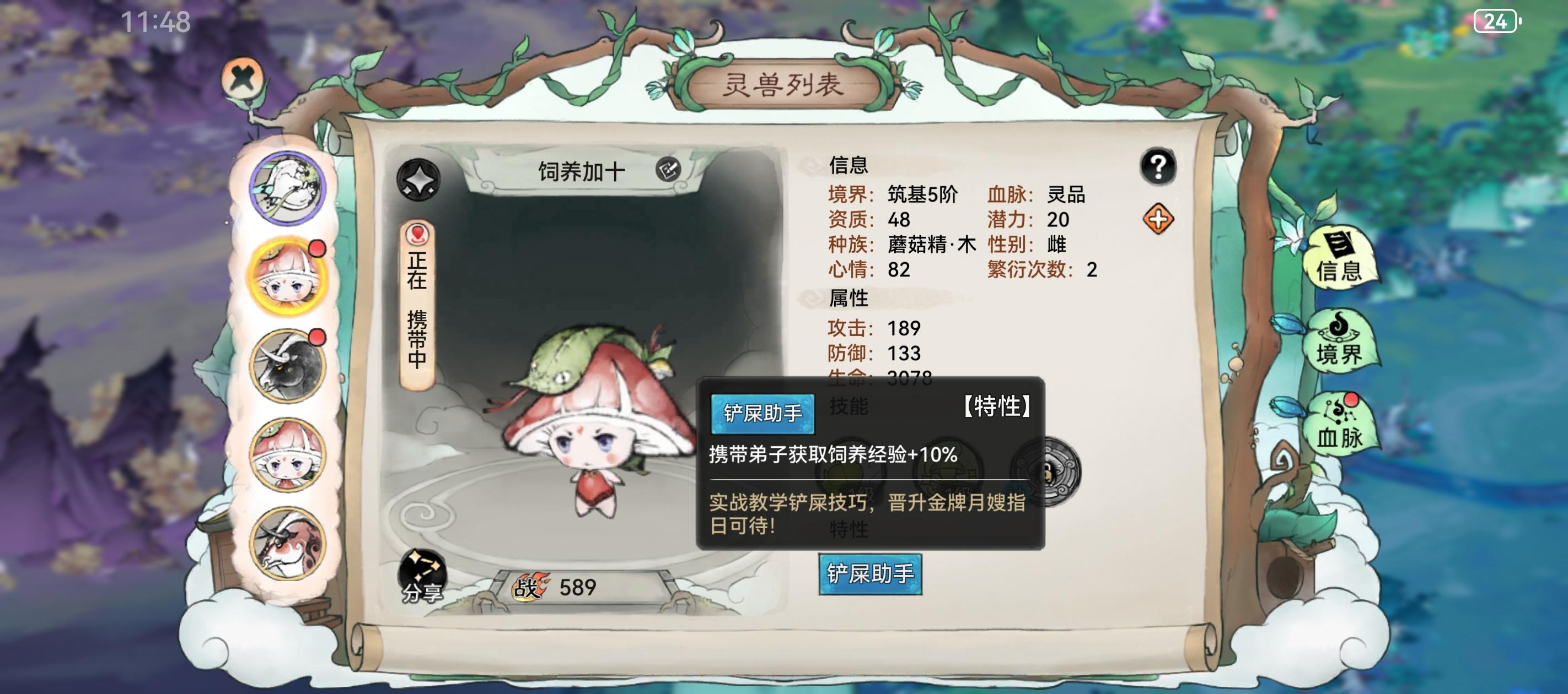 铲屎助手:携带弟子饲养经验+10%