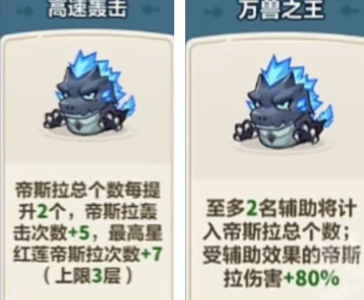 • 核心词条“万兽之王”:最多2名辅助计入帝斯拉数量,相当于免费加2个增伤格子(例:4帝斯拉+2天使=6只增伤效果);