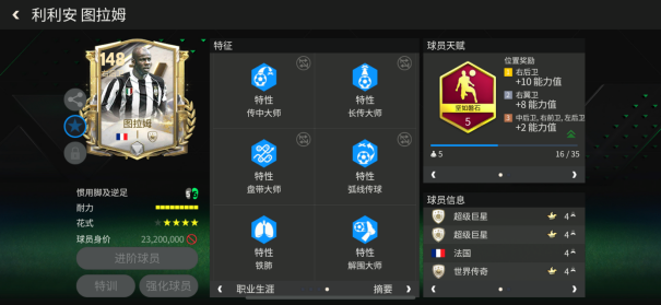 特性方面,图拉姆配备了铁人、铲球大师、传中大师、长传大师、盘带大师、弧线传球、铁肺、解围大师八项特性,这对他的防守表现和传球助攻能力都有进一步提升。