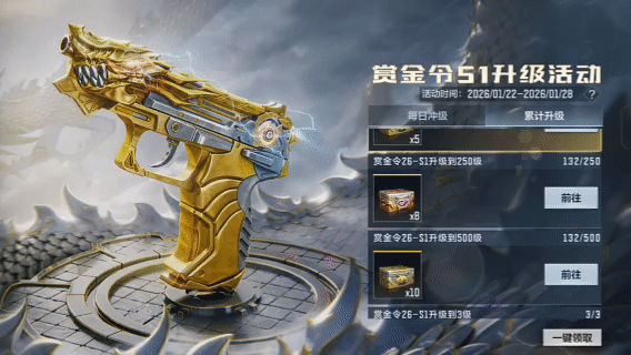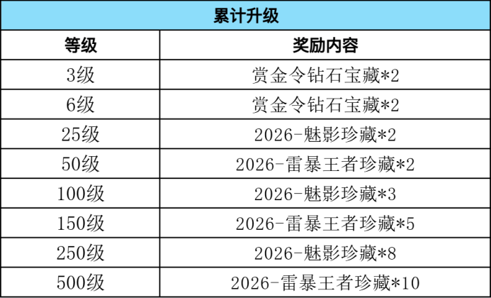 本期S1赏金令累计升级等级最大可升至500级。分为3级、6级、25级、50级、100级、150级、250级和500级档位。达到指定档位便可以拿下赏金令钻石宝藏、2026-魅影珍藏和2026-雷暴王者珍藏在内的稀有奖励。